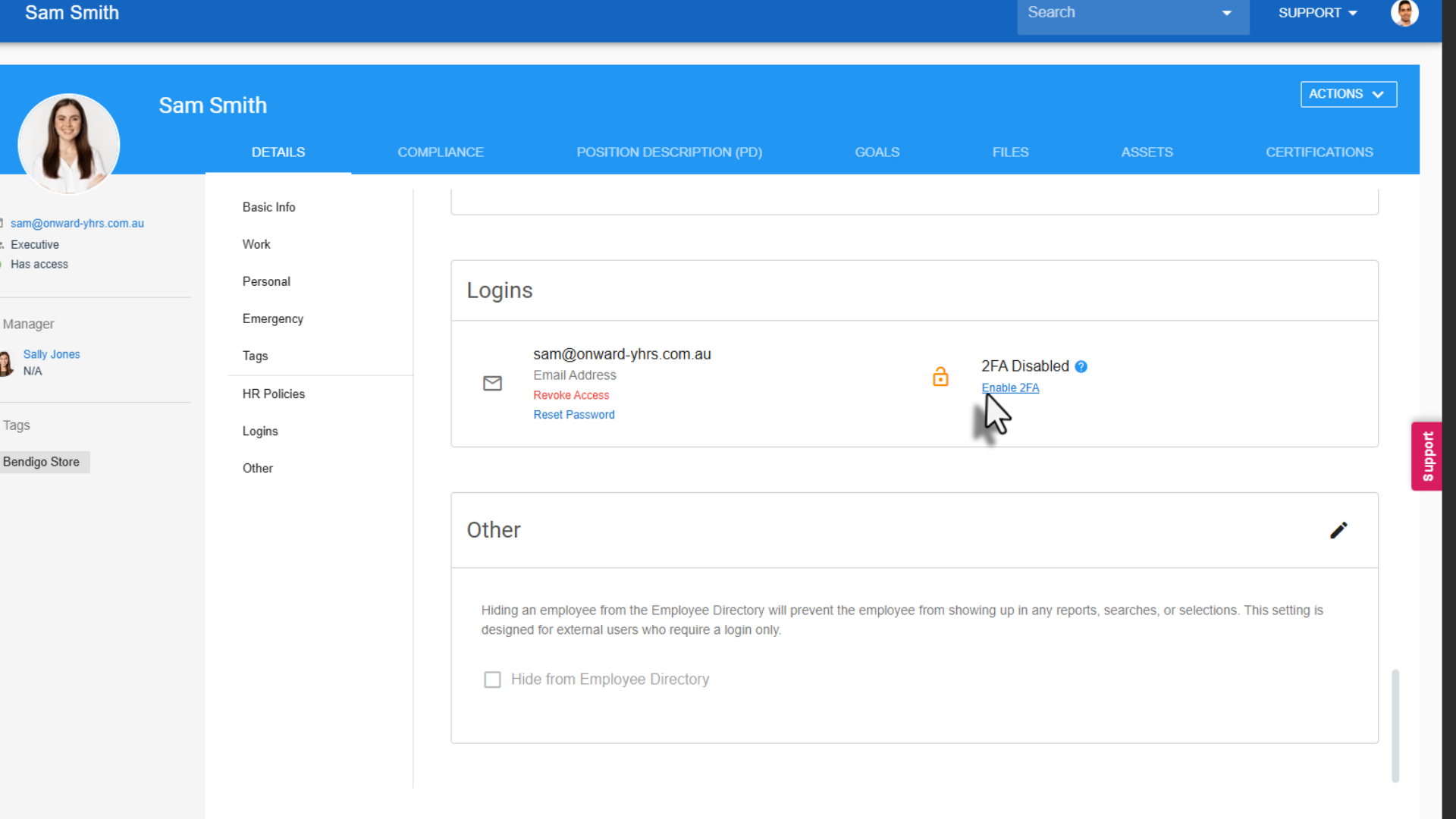 Two-factor authentication (2FA) adds an extra layer of security to user logins by requiring a verification code in addition to a password. Enabling 2FA helps protect employee accounts and reduces the risk of unauthorised access. This article shows you how to enable (and disable, if required) two-factor authentication for a staff member in Your HR System.