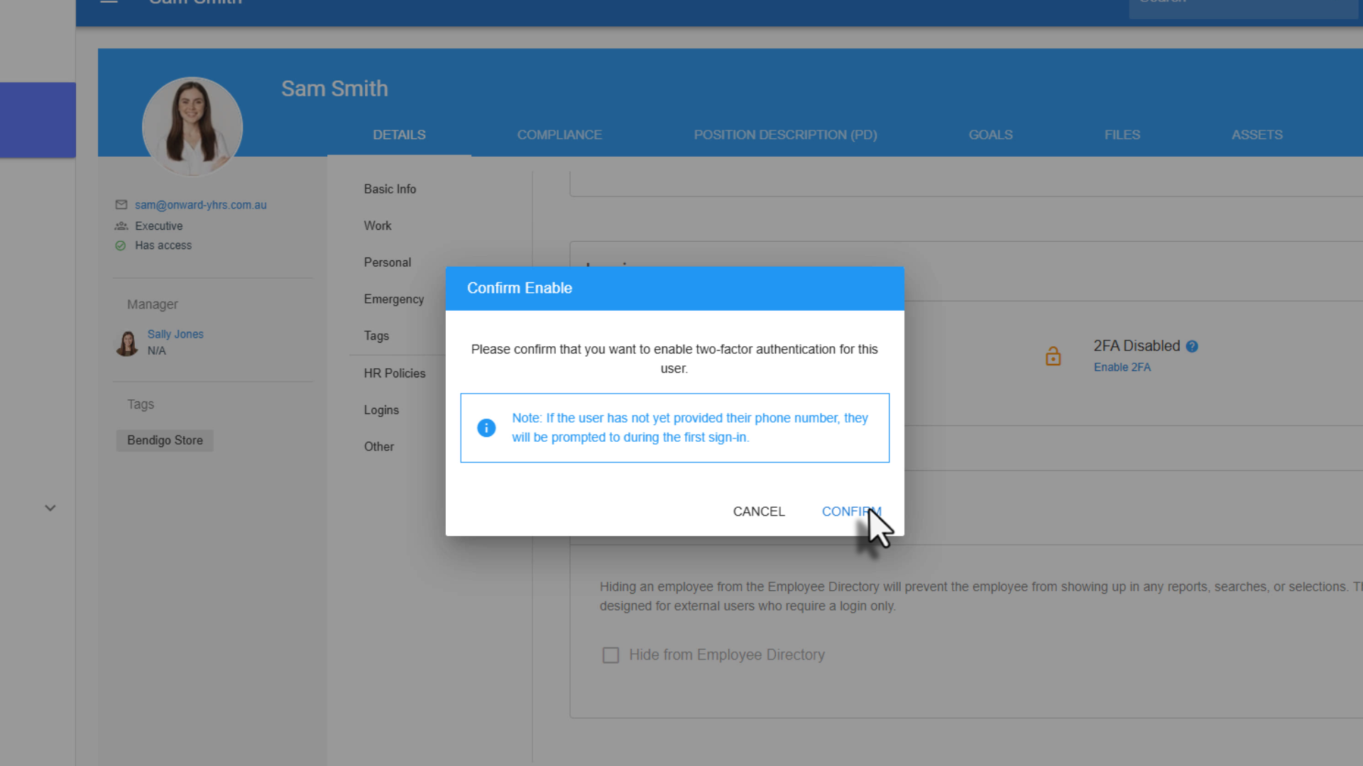 A confirmation window will appear. Select Confirm to proceed. Once confirmed, two-factor authentication will be enabled for that employee. If the employee has not yet provided a phone number, they will be prompted to enter one during their next sign-in.