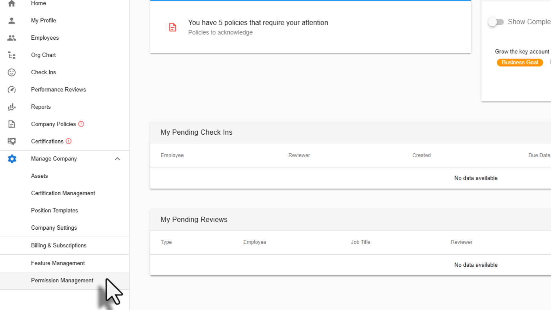 From the main menu, select Manage Company, then choose Permission Management. This is where all Custom Permission Groups are created and managed.