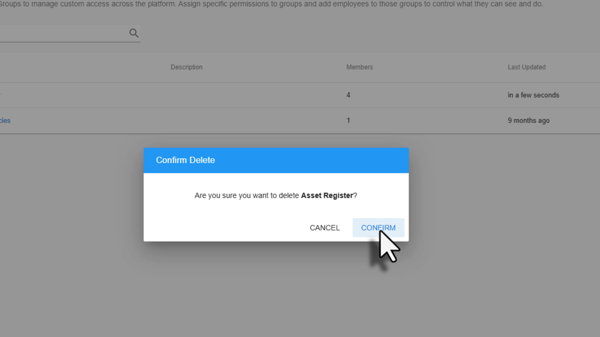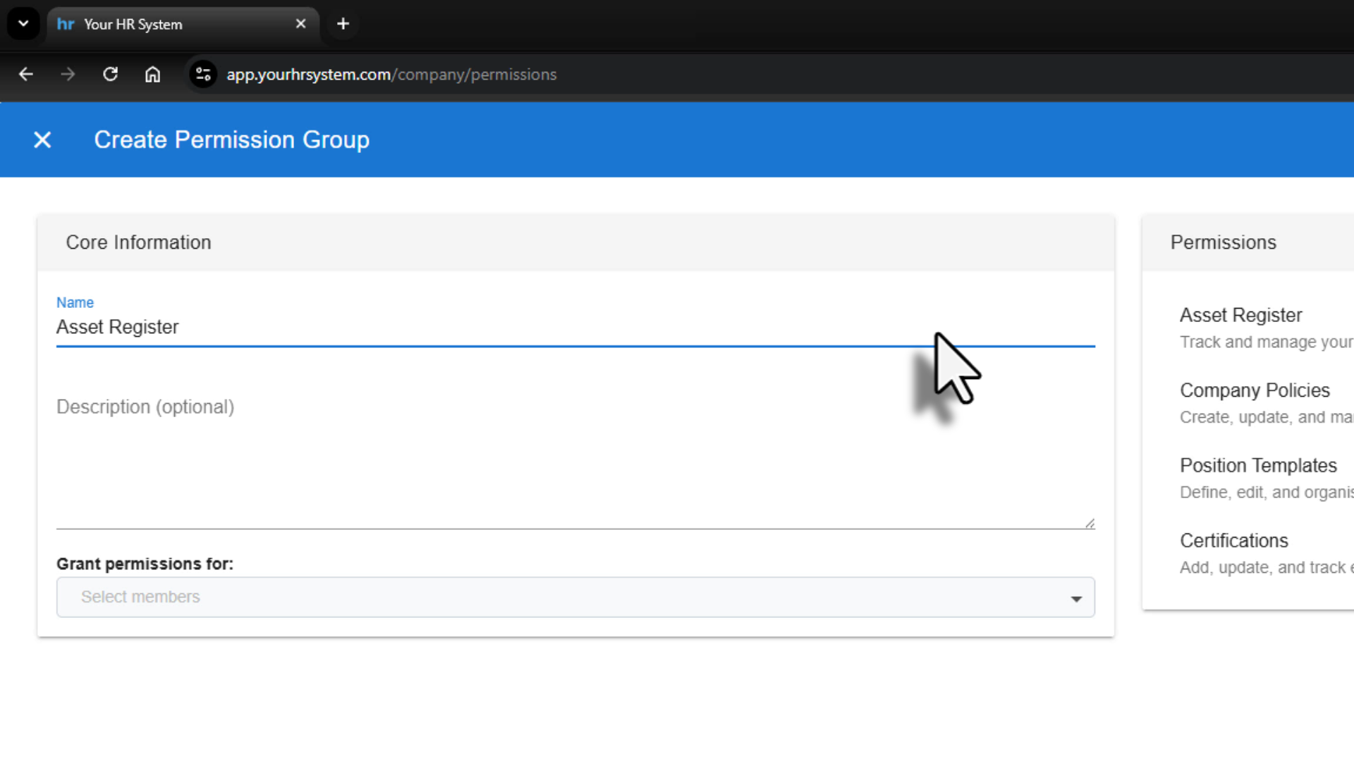 Give the permission group a clear, descriptive name that reflects the access it provides. For example, Asset Register or HR Policies.