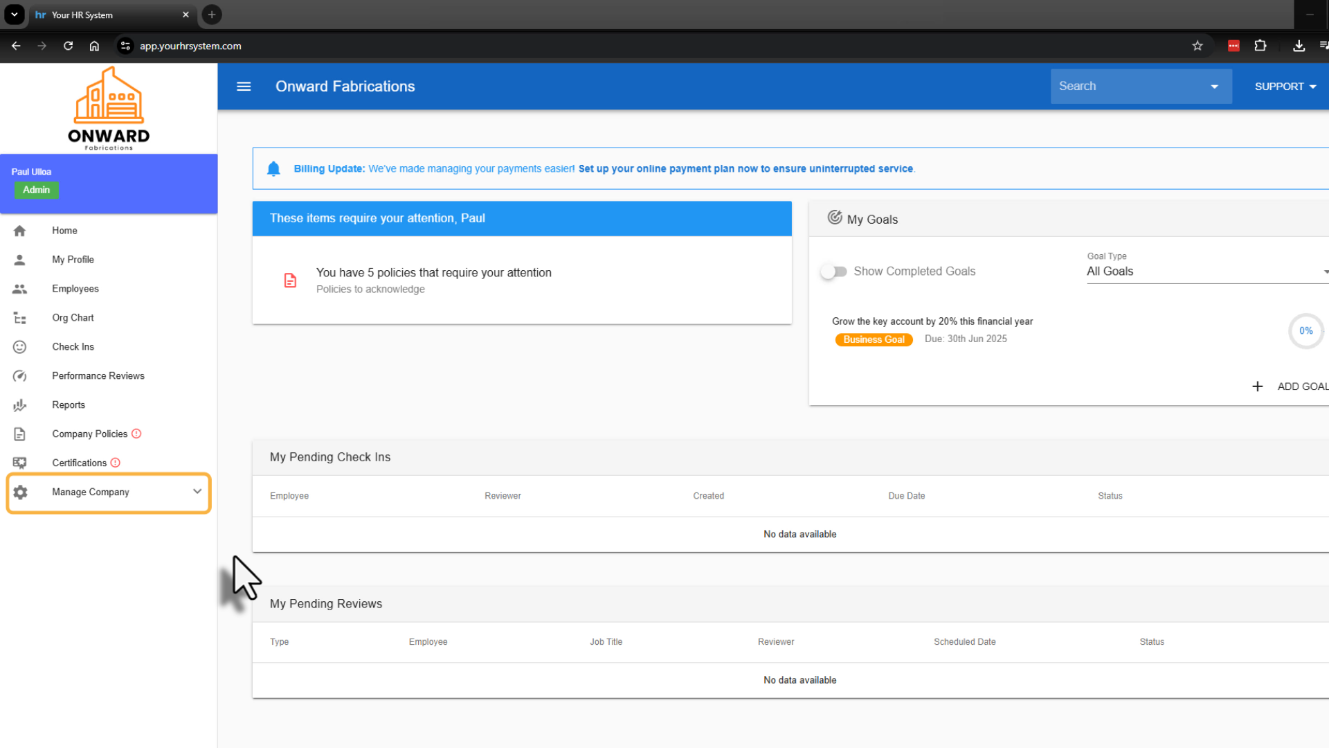 Compliance Reminders help you stay on top of important HR obligations by automatically prompting employees to review and acknowledge required compliance items.