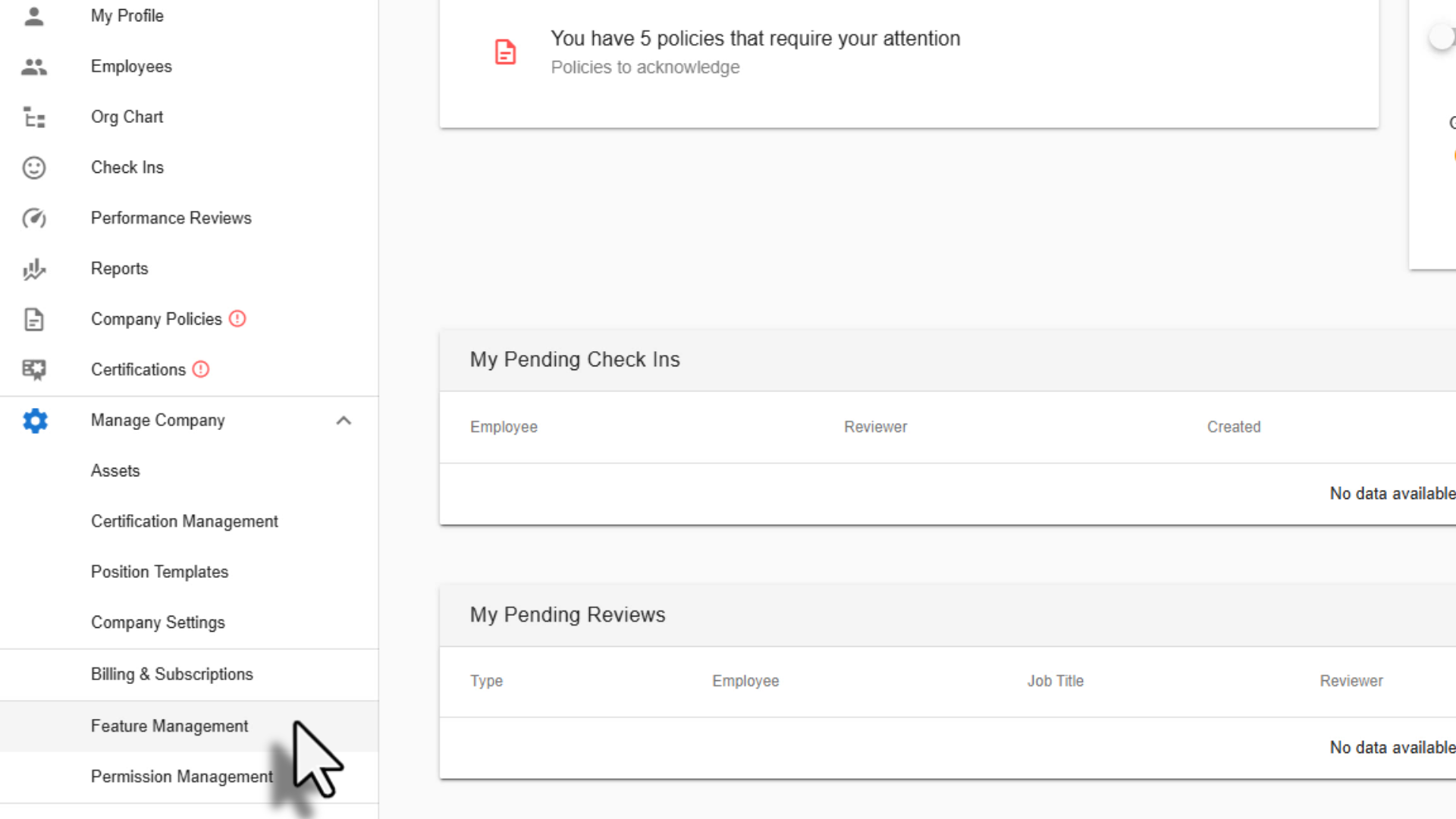From the left-hand menu, select Manage Company, then click Feature Management.