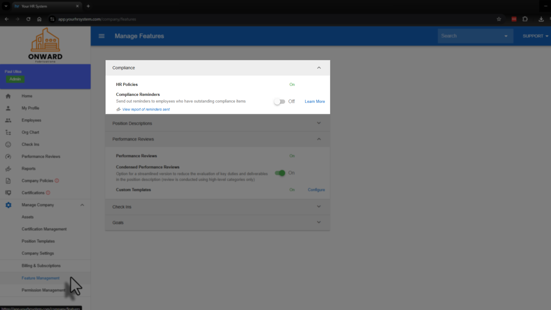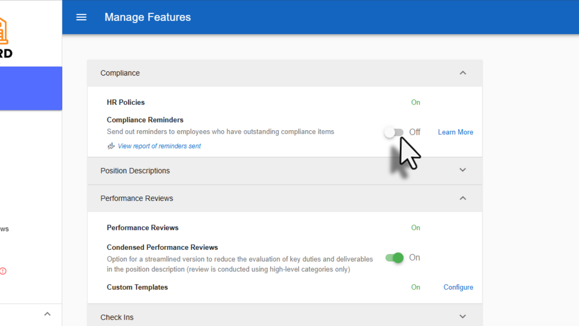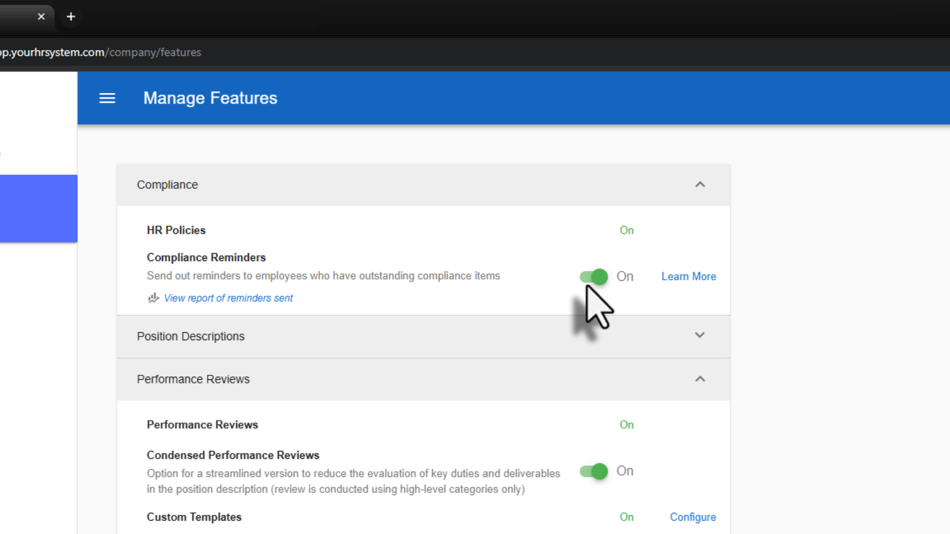 Within the Feature Management page, locate Compliance Reminders. Toggle Compliance Reminders on to enable the feature.