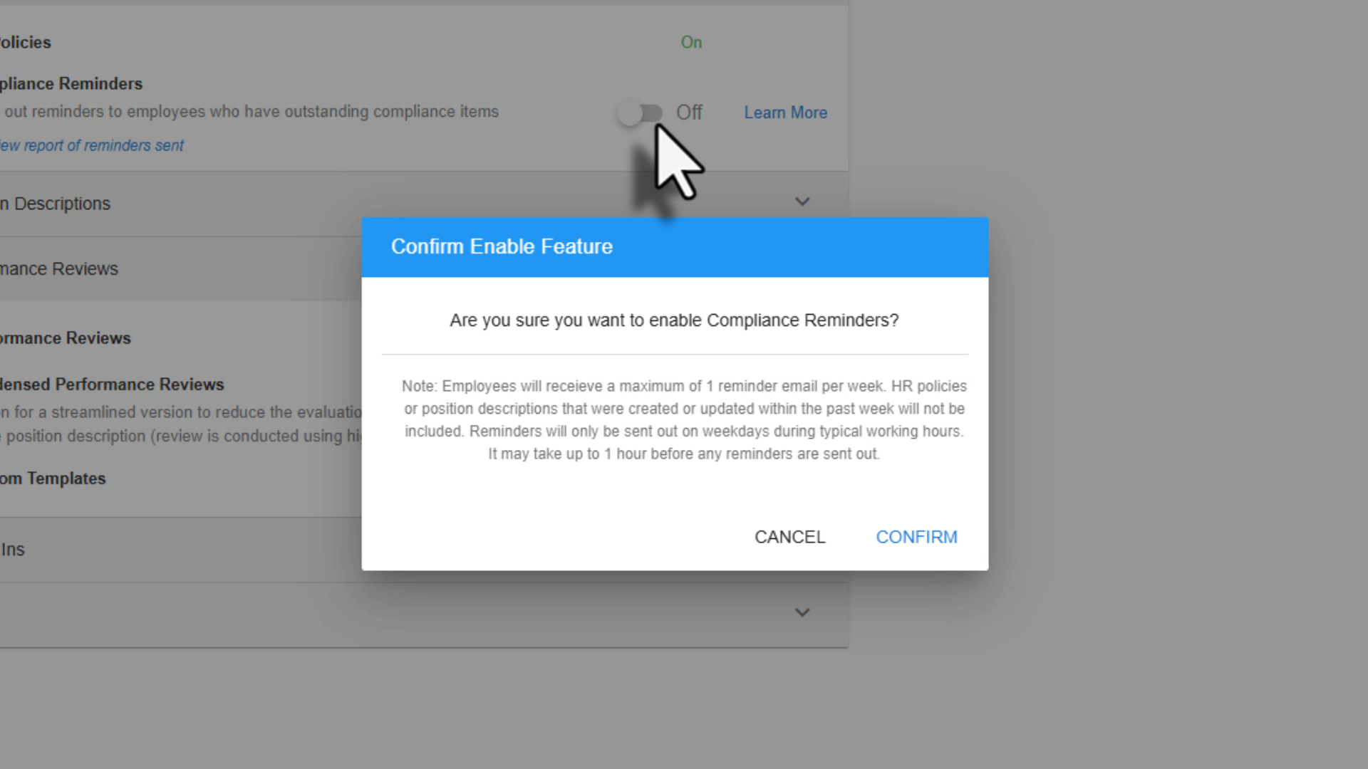 When you enable Compliance Reminders, a confirmation message will appear outlining how reminders work. This includes how often reminders are sent and that HR policies created or updated within the last week will not be included in reminders straight away.