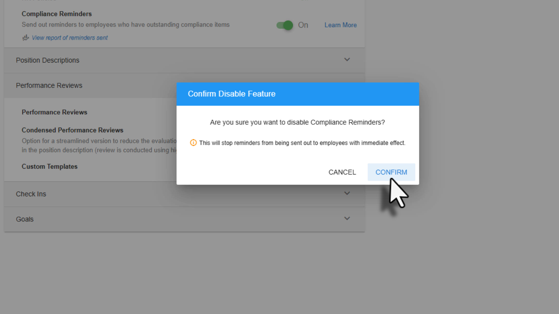 If you ever need to disable Compliance Reminders, go to Manage Company and Feature Management. From there, toggle Compliance Reminders off and select Confirm to apply the change.